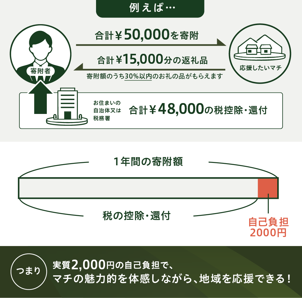 ふるさと納税とは、生まれ育った故郷や応援したい自治体に寄附ができる制度です。手続きをすると、寄附金のうち2,000円を超える部分については所得税の還付、住民票の控除が受けられます。あなた自身で寄附金の使い道を指定でき、地域の特産品などのお礼の品ももらえる魅力的な仕組みです。